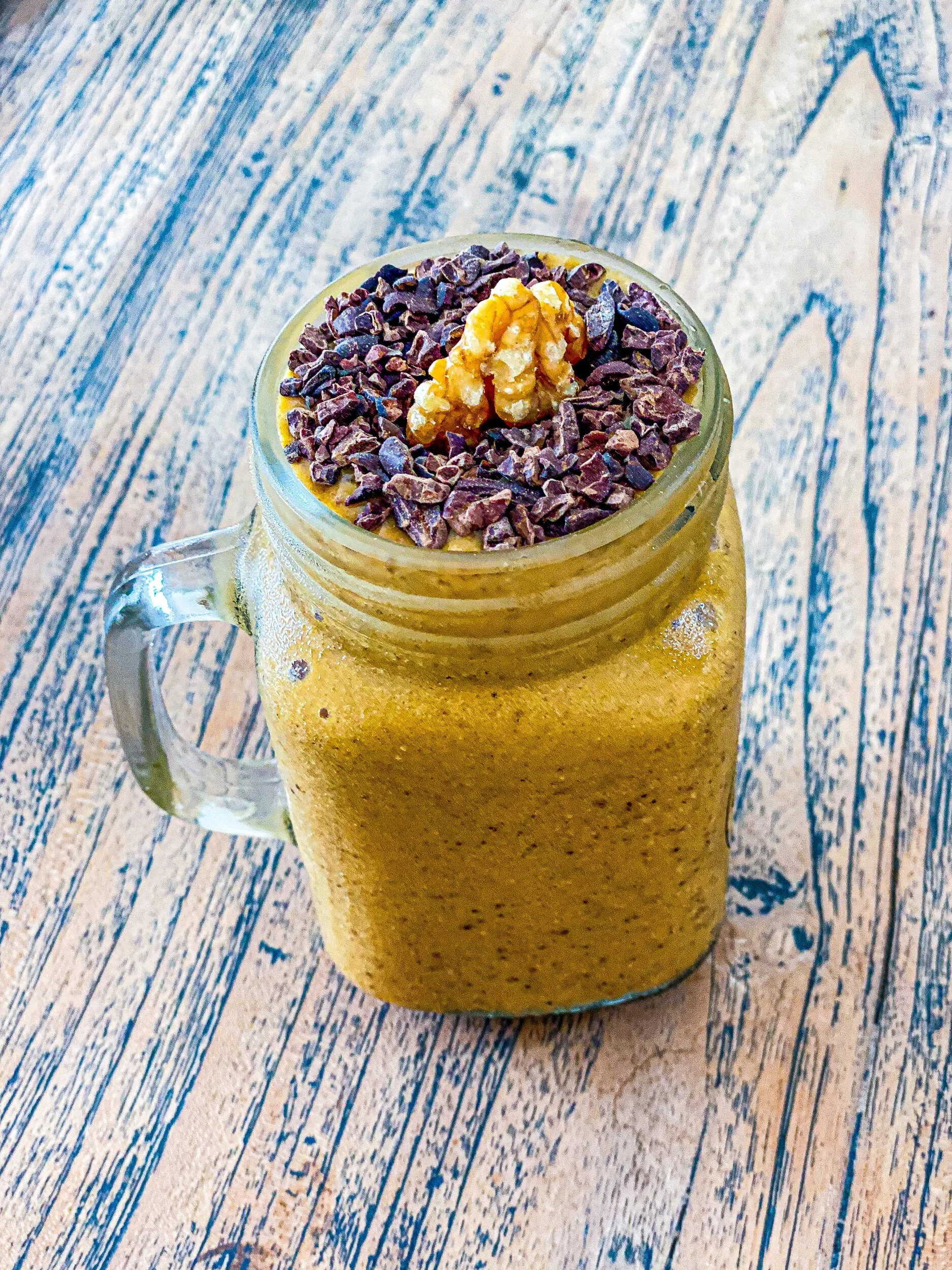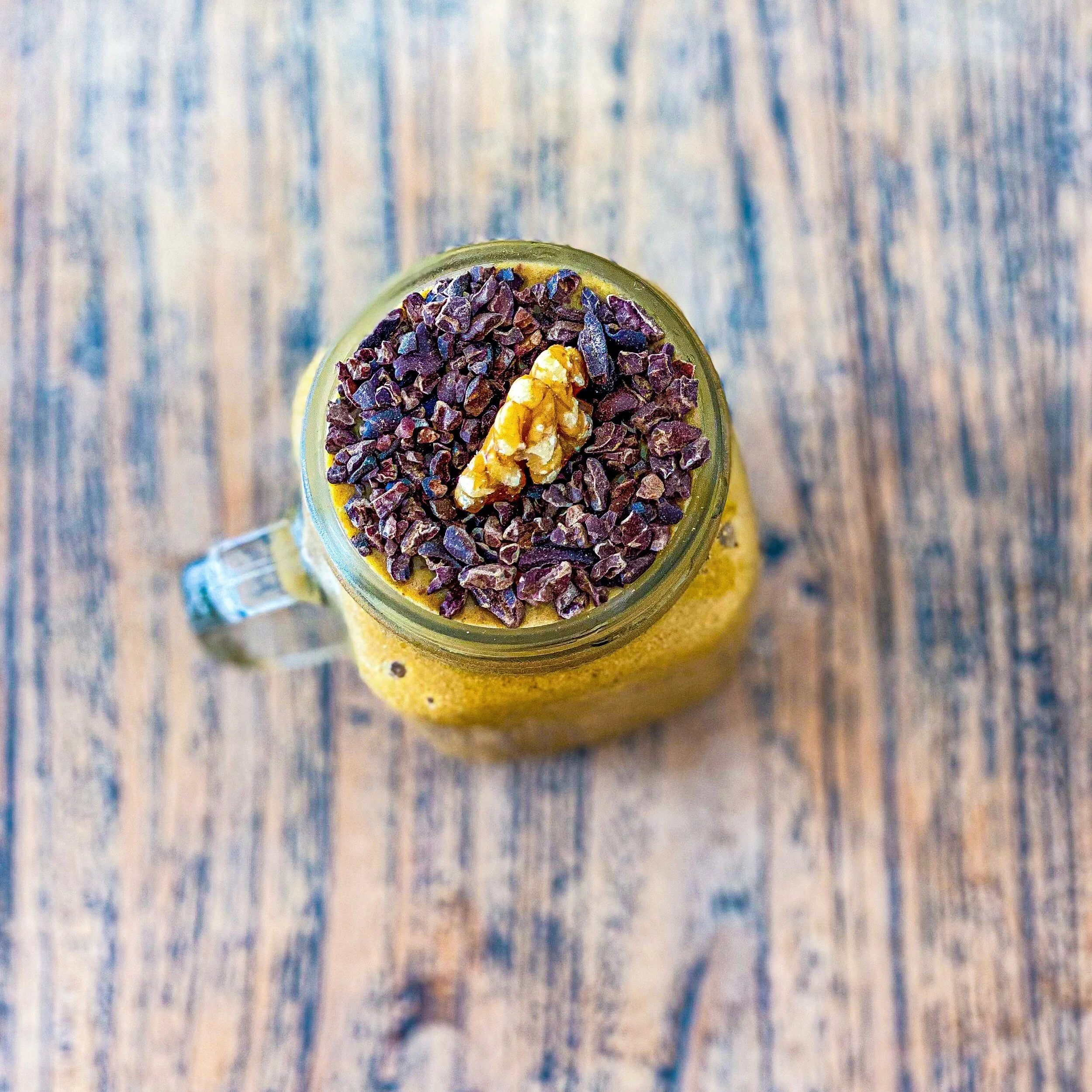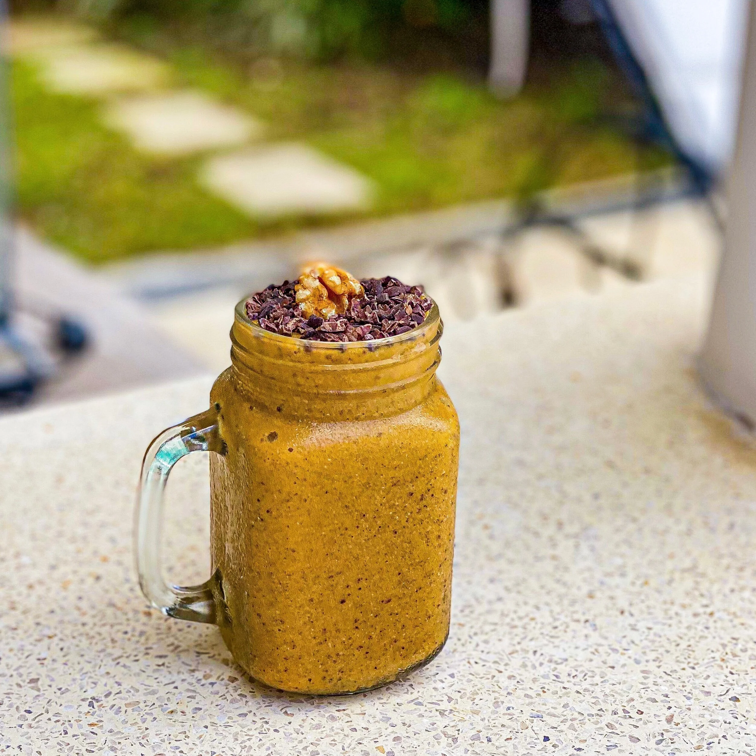 Place All Ingredients in Blender and Blend for 3 Minutes. Pour into glass, top with a few cacao nibs for extra crunch. Enjoy.